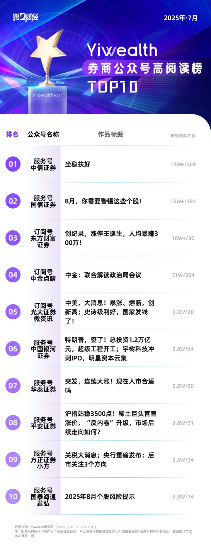 公众号方面,市场行情热点成为核心主题,如国信证券《8月,你需要警惕这些个股!》、平安证券《沪指站稳3500点!稀土巨头官宣涨价…..》等,直接关联实时行情与政策动态,反映用户对时效性、决策指导性内容的高度需求。