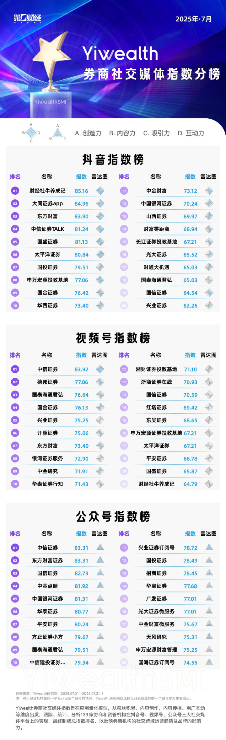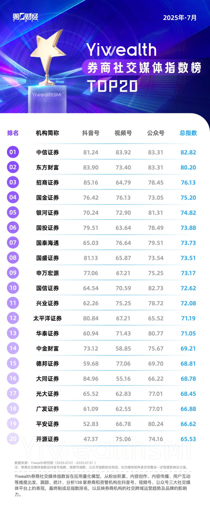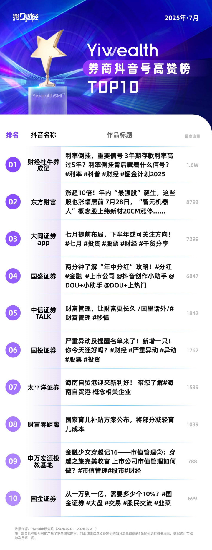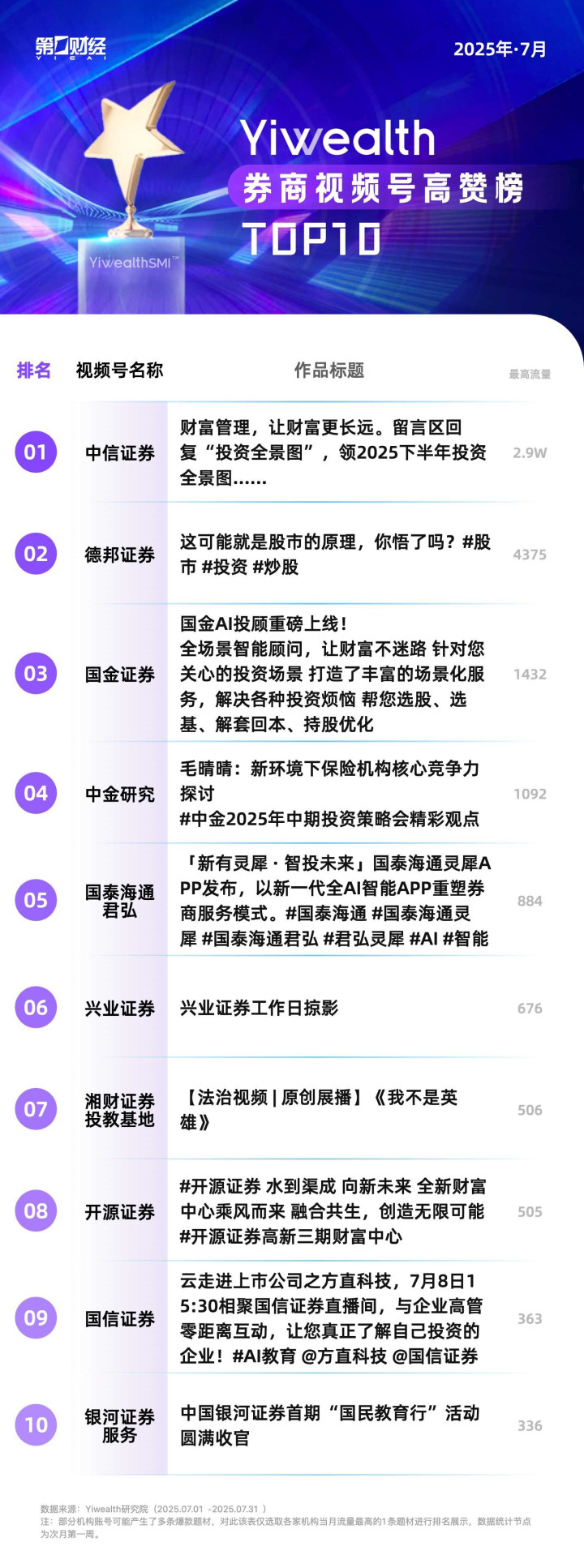 万得数据显示,7月A股市场情绪显著转暖,沪、深两市成交额分别突破15.6万亿和21.4万亿元,环比激增超30%,齐创年内新高。市场活跃度的提升,也带动券商社交媒体上关于市场行情解读的内容成为流量热点。