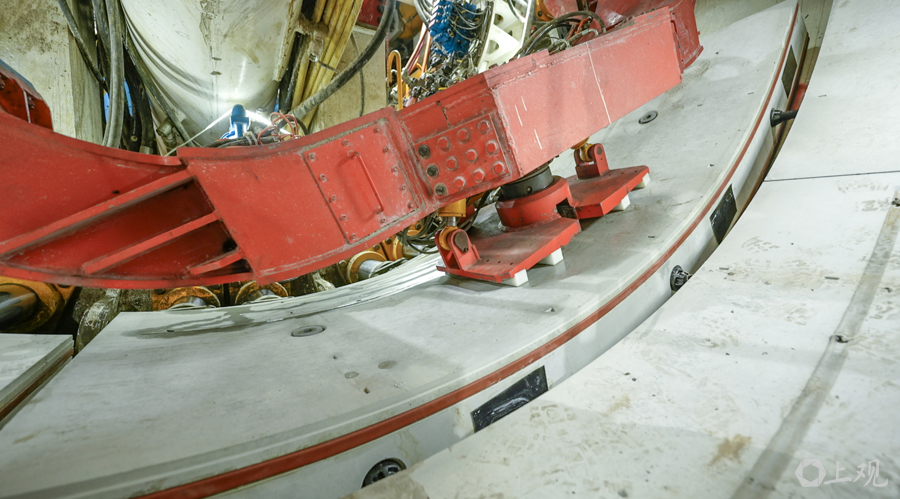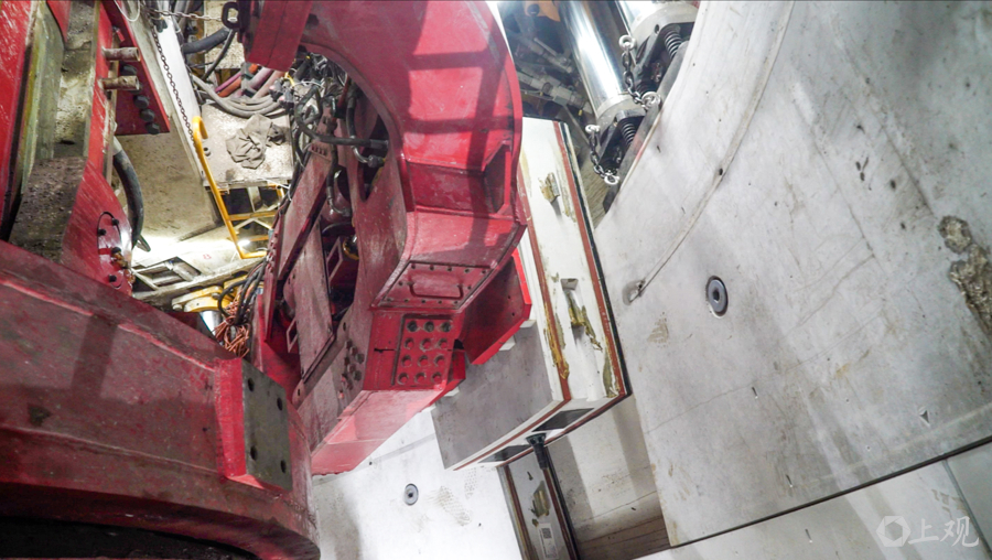 数智盾构机的管片拼装机系统对刚完成掘进的区域进行承插式接头管片拼装。